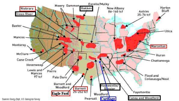 主なものは以下のガスシェールと油田。