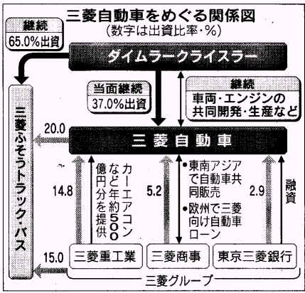 独ダイムラークライスラーは22日、経営再建中の三菱自動車への増資計画に応じず、今後の財務支援も行わないと発表した。同日臨時に開いた取締役会と監査役会で決定した。ダイムラーは今後、保有する三菱自の37%の株式を売却し、資本提携を解消する可能性もある。三菱重工業、三菱商事など三菱グループ各社がダイムラーと策定してきた三菱自再建計画は最終段階で白紙に戻されたことになり、今後は三菱グループがどこまで三菱自を支えられるかが焦点となる。