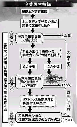 非主力行と買い取りで合意すれば、機構は主力行と提携して企業支援を始める。普通株購入や債務を株式に転換する「デット・エクイティ・スワップ」などで財務を改善。監視役となる新たな経営者も送り込む。再建計画の期限は原則3年。対象企業が経営再建に成功すれば、非主力行から買い取った債権を企業再生ファンドなどに売却する。