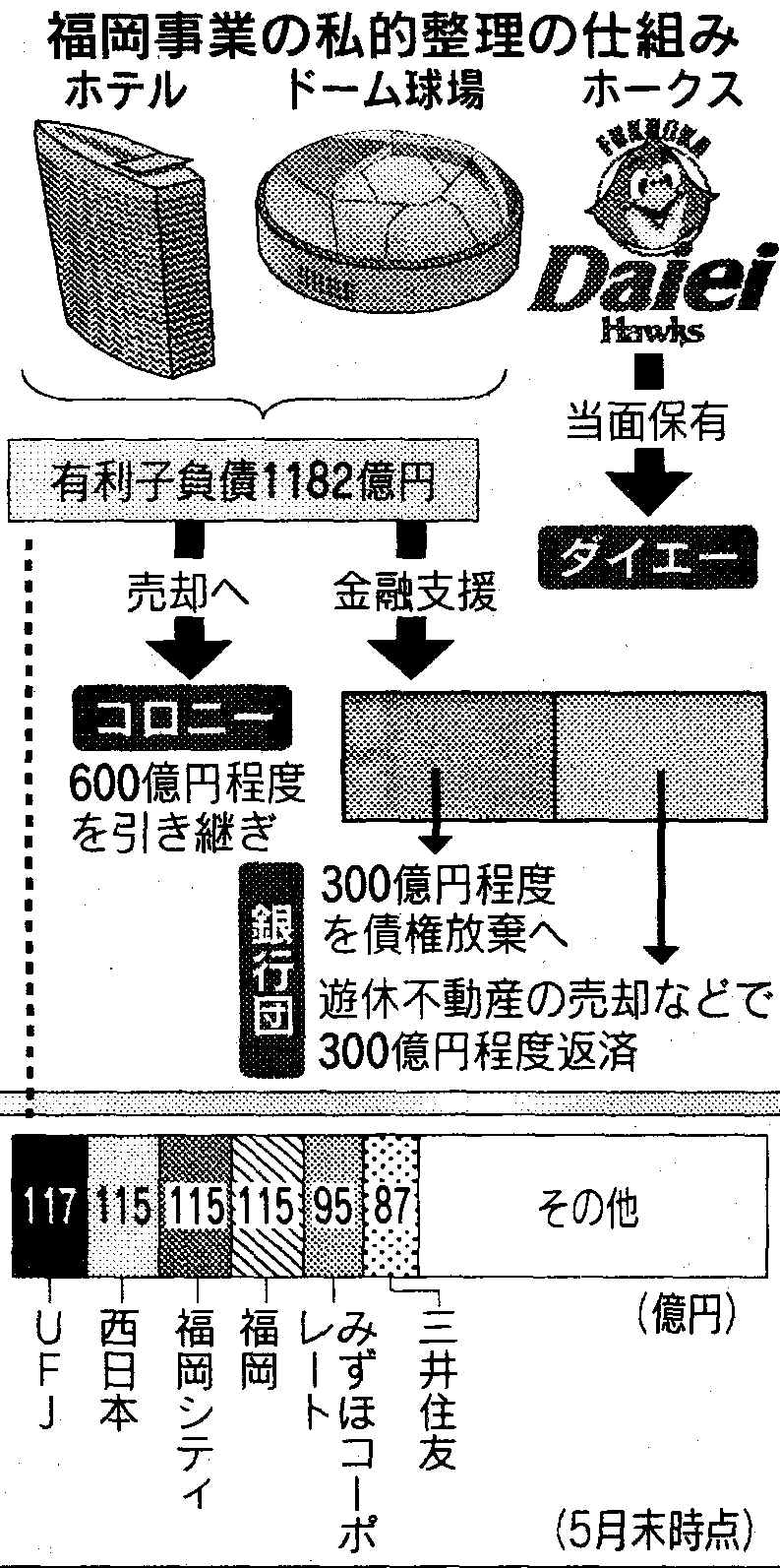 ダイエー側はホテルと球場を売却する際に、取引金融機関から300億円程度の債権放棄を受けて、債務超過を避けなければならない。当初は主力以外の金融機関が持つ貸出債権を再生機構に買い取ってもらうつもりだったが、見直しを余儀なくされる。