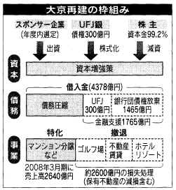 そこで、今回の大京支援では出資はせず、数カ月のうちに決定する民間スポンサーに経営を委ねる。スポンサー選定にさほど時間はかからないとの見通しがあるうえ、後に続くダイエー問題への配慮がにじむ。