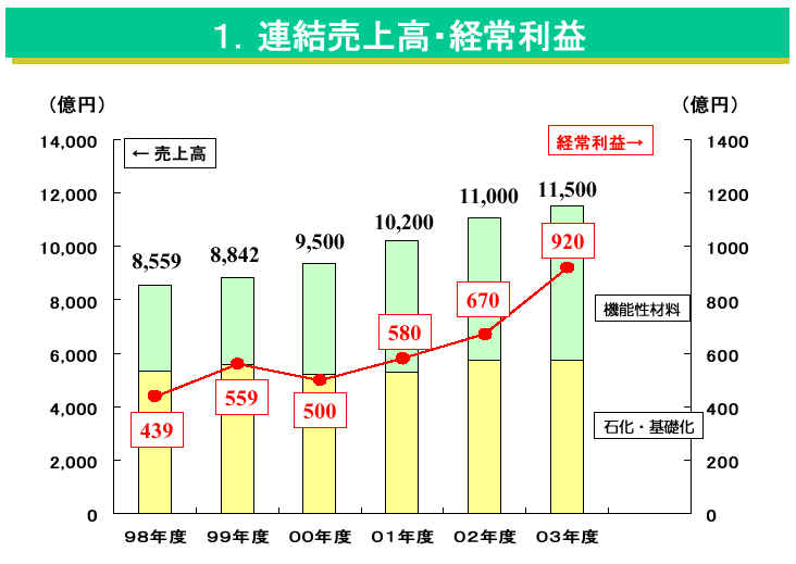 中期計画では、2000年度の売上高を7千8百億円、経常利益を480億円(97年度は売上高5280億円、経常利益260億円の見込み)に設定した。さらに投融資額を減価償却の範囲内に抑え、ポリエステル原料のテレフタル酸やフェノール樹脂、ウレタン原料、半導体材料などの中核事業に投資先を絞り込み、利益率を上げる。