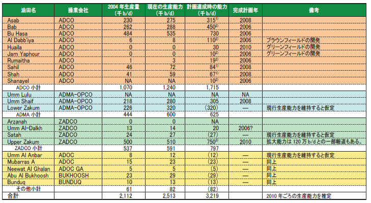 ADCO の権益保持者は、ADNOC (アブダビ国営石油):60%、BP 9.5%、Shell 9.5%、Total 9.5%、Exxon Mobil 9.5%、Partex (ポルトガル) 2% である。ADCO を構成するIOC (国際石油企業) は、権益期限の2014 年を延長することはこの増産計画等を達成するための投資インセンティブと達成保障になるとしている。ADCO の権益延長交渉は2003 年に開始されたが、現在も条件の設定作業を行っている。政府筋の一部は、現在の条件では政府の考える生産拡大は困難であると考えている。