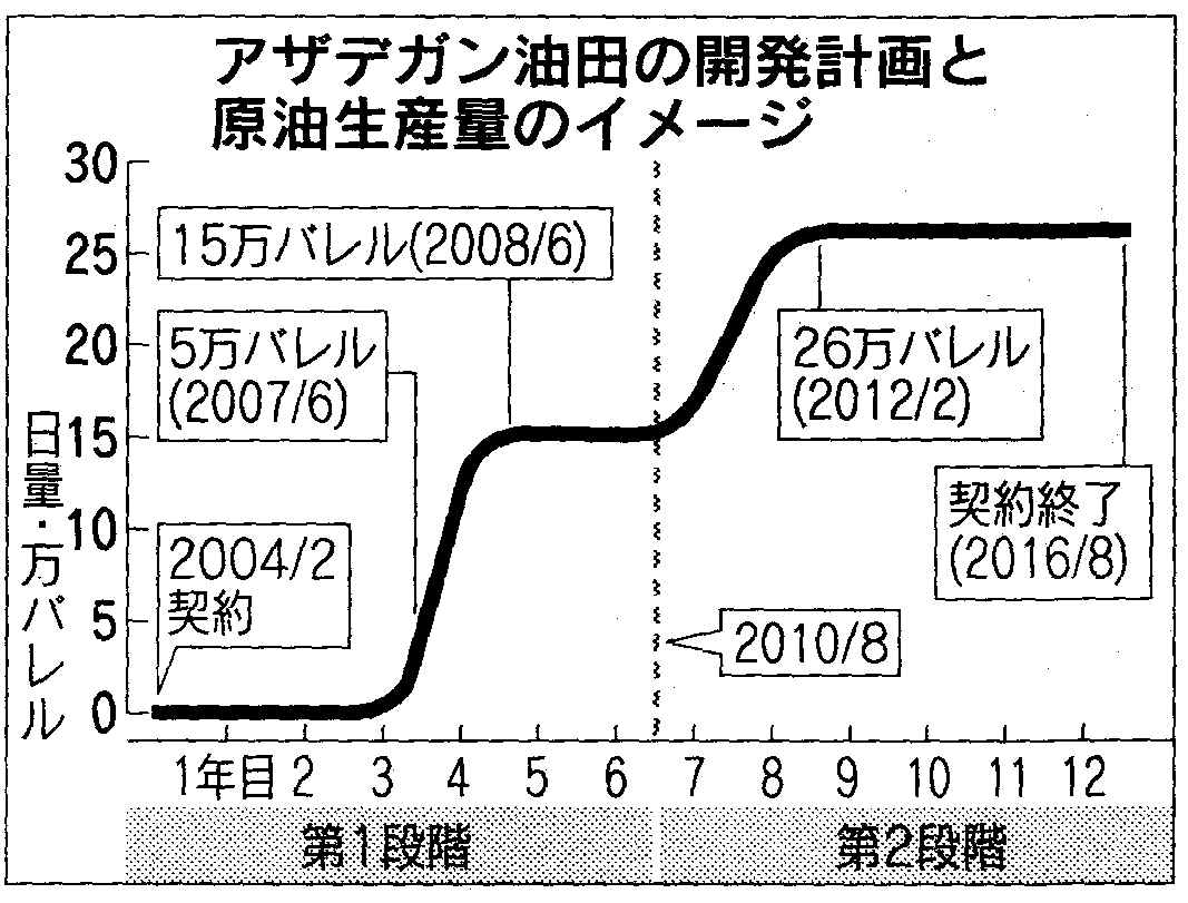 事業総額は20億ドル。原油生産量を2008年6月までに日量15万バレルとし、2021年2月までに日量26万バレルに引き上げる。日本側が原油を受け取る形で投資資金を回収できる契約期間は第一段階が6年半、第二段階が6年、合計12年半に限られる。