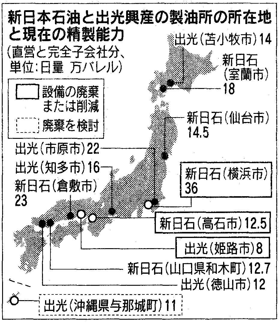 一方、新日石は日量36万バレルの精製能力がある根岸製油所と同12万5千バレルの大阪製油所(大阪府高石市)を、一部設備を停止するなどして根岸は同2万バレル、大阪は同1万バレル能力を削減する。不足分は出光からの製品引き取りを増やす。