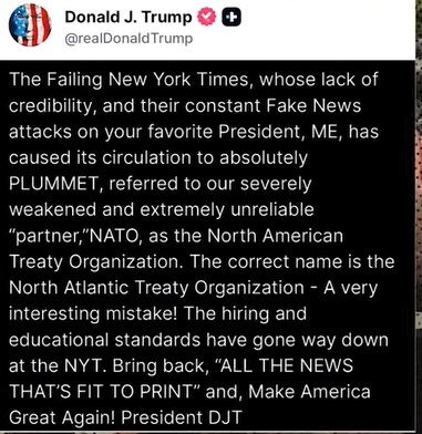 トランプSNS NATOは何もしていない。米国はNATOから何も求めない。