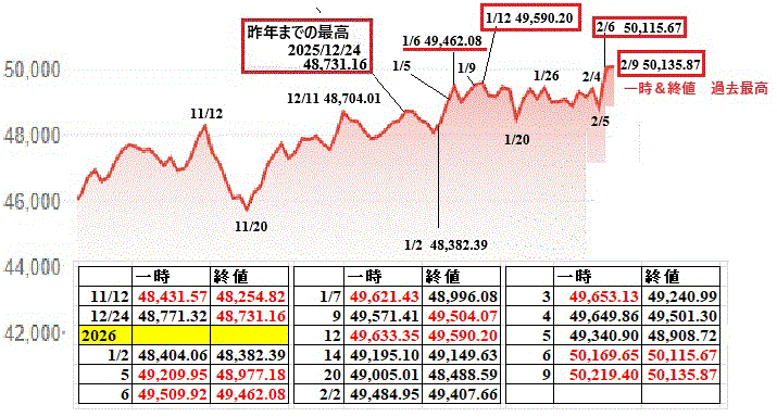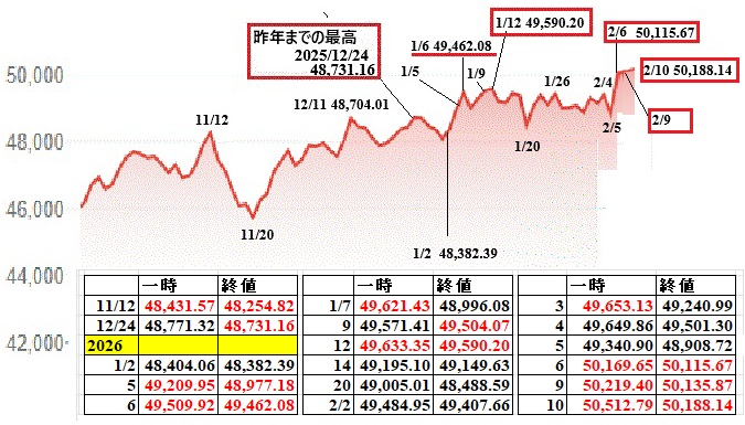 日経平均 2日連続で最高値更新  一時は5万8千円に近づく。