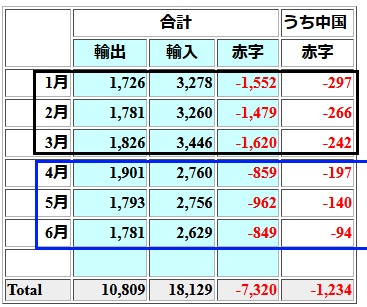 貿易赤字 1〜3月関税アップ回避のため先行輸入で大幅増加、4-6月は1-3月の反動で輸入が減少→貿易赤字減