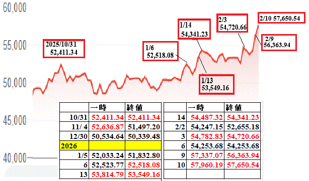 日経平均 自民圧勝を受け、一時、初の5万7千円台