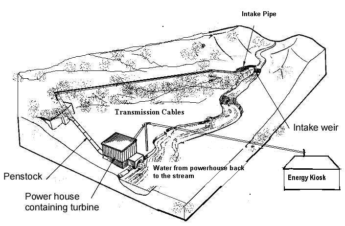 Water from the local stream called Mukengeria, which originates from the slopes of Mt. Kenya is dammed by a small weir and part of the water diverted to drive the two hydro turbines. Water, after driving the turbines is returned to the stream. The electricity is evacuated to the energy kiosk by two transmission cables. Once at the kiosk, the electricity is stabilized by a simple electrical charge and controller system as illustrated below.