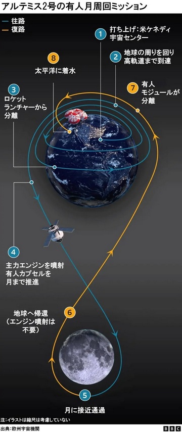 今回の「アルテミス2」計画では、宇宙船「オリオン」に乗った宇宙飛行士4人が今後10日間にわたり、月まで飛行し、