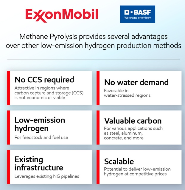 ExxonMobil, BASF to Partner on Methane Pyrolysis Demonstration Plant in Baytown, TX CO2でなく、固形炭素製品ができるため、カーボン補足・貯蔵処理が不要