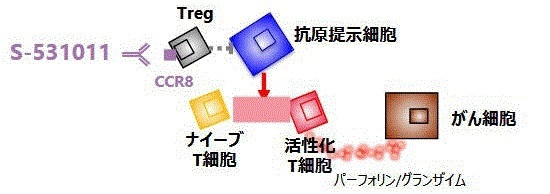 その過程で、2018年に腫瘍浸潤制御性T細胞に特異的に発現する分子としてCCR8を新たに同定し(特許成立済)、この成果を基盤にCCR8を標的とした抗体医薬「S-531011(抗CCR8抗体)」のがん領域でのPhase