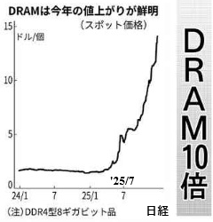 半導体メモリー価格高騰   メモリー・メーカーが高採算のAI サーバー向けに生産をシフト、パソコン向けなどへの供給減少  パソコンメーカー、転嫁値上げへ  (日経報道)