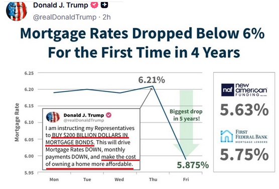 トランプSNS  住宅ローン金利  Mortgage bond (住宅ローンなどの不動産関連の貸付債権を裏付けとして発行される債券)を2000億ドル分買うよう指示した。→住宅ローン金利はバイデン時代の8%から5.7%に下がった。