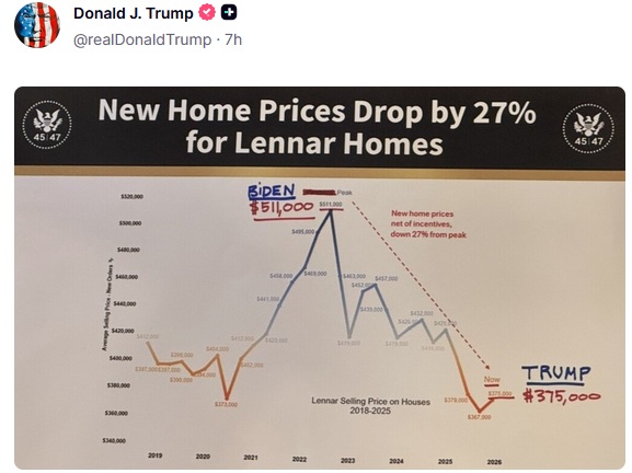 トランプSNS いつもの自慢 Biden 時代と比べ、住宅価格が27%下落    Lennar は米国第2位の住宅建設会社