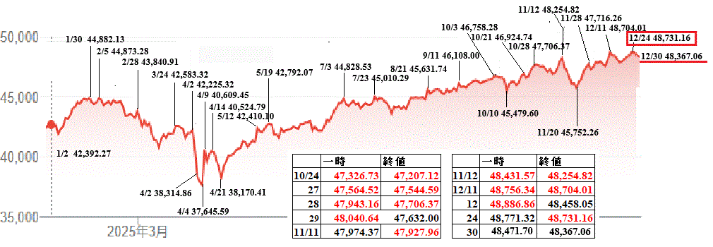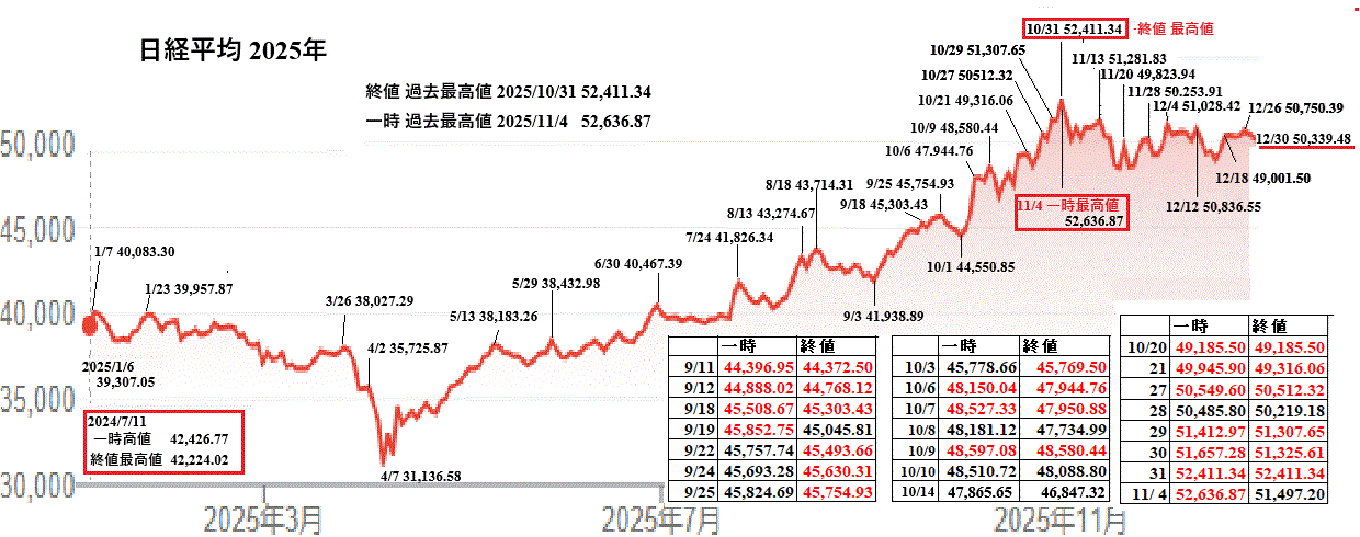 大納会の日経平均終値187円安の50,339.48円 年間で1万円超上昇