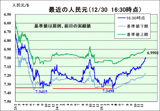 12/30 16時30分時点の人民元、対ドルで6.9901元 2023年5月以来の高値