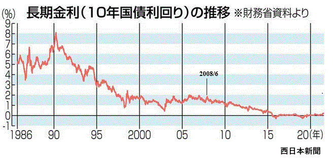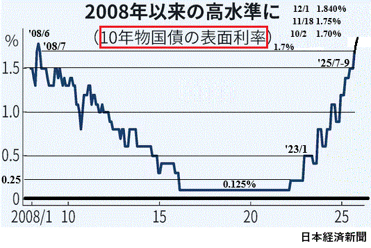 12月5日の国内債券市場で長期金利が上昇(債券価格は下落)新発10年物国債の利回りは1.950%と2008年6月(1.895%)以来およそ18年ぶりの高さ    12/4 記事 過去の推移グラフ参照