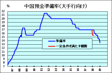 2018年7月5日から預金準備率を0.5ポイント下げ、大手銀行の標準的な準備率を15.5%に下げた。