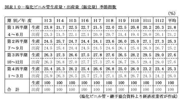 | 塩化ビニル管の季節別の生産・出荷を見ると、次表のとおり一般的に塩化ビニル管の需要期である秋に多く、春の不需要期には少なくなっている。これは下水道などの公共分野の需要が、春に少なく秋に多いことが主因となっている。各社は一般的には不需要期の在庫積増又は需要期の生産増(生産能力の増加)による対応のうち、現在は需要期の生産増で対応している。出荷量の近年の実績と過去の実績を比較すると下水道等の公共需要比率が高まってきたのに伴い、需要期と不需要期の差は大きくなっている。また、流通段階における在庫量の減少も需要期と不需要期 の生産・出荷の差が大きくなっている一因になっている。 |