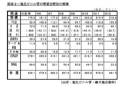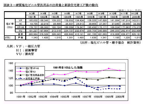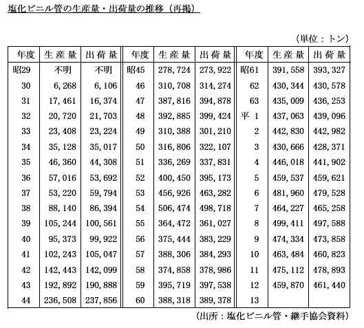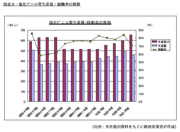 | が行われ、工場数は26から21に、生産能力は628千トン/年から521千トン/年に、押出機は559台から424台となった。 このように構造改善事業の結果、需給バランスは改善し、経営状況も安定したことから構造的不況から脱したとして、今後は事業環境の激変がない限り、事業者の自主的な事業活動によっても再び構造的不況に陥ることがないと判断され、昭和63年3月1日をもって産構法の業種指定を取り消されることとなった(産構法は昭和63年6月30日をもって廃止。) しかしながら、その後の需要の伸びが期待できないこと、近隣諸国において設備増強が進んでいるなど不安定要因も残されていたことから、平成元年7月に産業構造審議会塩ビ・ソーダ小委員会の下に硬質塩化ビニル管分科会を設置し、(1) 構造改善事業の実施後の合理化状況等の把握、(2)今後の硬質塩化ビニル管の需要動向の把握、(3) 今後の硬質塩化ビニル管製造業を取り巻く諸問題の調査・研究を行うこととなった。同分科会での検討の結果、国内需要は昭和63年度実績の436.3千トンが平成5年度予測で472.7千トン、生産量は同435.0千トンが472.0千 トン、生産能力は同541.4千トン(410台)が544.1千トン(406台、稼働率は同)80.3%が86.7%と予測され、業界の健全な発展には今後も合理化を進めることが重要との結論を得た。 平成4年8月には化学製品課長と業界代表によって産構法後の塩化ビニル管業界の進め方について検討が行われ、塩化ビニル管製造業の工場設備能力の把握の継続、塩化ビニル管各社による生産実績の集計・報告、塩化ビニル管の長期需要見通しの作成、産構審分科会を必要に応じ開催することが決められた。 その後、平成8年度にはこれまでで最高の生産・販売実績となったこと等により、生産能力も増加したが、平成9年には住宅着工の不振の影響を受け需要が減退したことに伴い、平成11年から平成12年にかけて大手メーカーを中心に自主的な設備廃棄がなされたものの、需給ギャップを大きく改善できないまま今日に至っている。 |