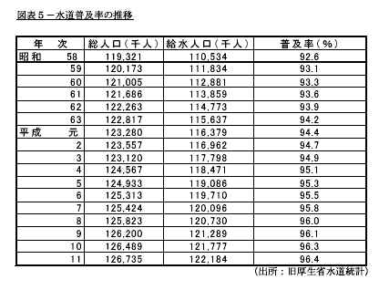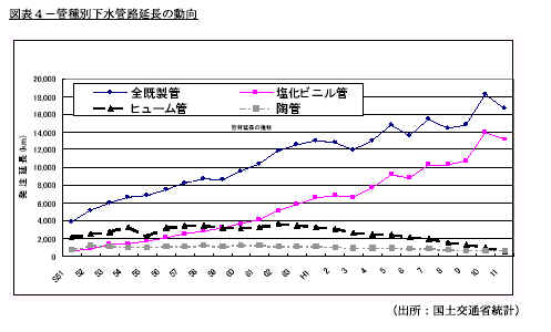 | 下水道用の塩化ビニル管は、主として公共下水道、集落排水などの汚水本管・取り付け管・雨水本管に使用され公共下水道用で80%が占められる。使用サイズは公共下水道用が主に大口径、集落排水用が中口径となっている。下水道用塩化ビニル管は総需要のうち約25%を占めている。なお、一部は農業集落排水用にも使用されている。 我が国では下水道の普及が遅れていたことから、公共下水道の整備が計画的に実施され、第8次7カ年計画(平成8年度〜平成14年度)では下水道の普及率を54%から66%にすることを目標として下水道の整備が行われてきている。この分野での管材の使用は、概ね旧建設省及び農林水産省の事業予算に連動して推移してきているが、塩化ビニル管は他の素材を代替する形でシェアを拡大しつつ、需要を伸ばしてきた。 近年ではコスト縮減方針による管径のダウン、大都市部の整備の進展による中小都市への需要の移行、素材代替の頭打ち等のため、塩化ビニル管使用量が減少傾向にあり、平成12年度の販売実績では初めて前年比マイナスとなった。今後、公共下水道普及率が90%程度となるまでは大幅な需要減は無いものと考えられる。 競合管としては本管ではヒューム管が、取付け管ではヒューム管及び陶管が上げられる。ヒューム管は昭和63年以降塩化ビニル管など他管種への取り替え等により常に減少傾向にあり、また、陶管は一部の地場産業としての限定的な使用と考えられ、いずれも使用割合としては一桁代のシェアにとどまっている。 |