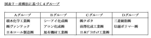 | 塩化ビニル管産業の歴史を振り返ると、各社のシェア拡大競争などによる設備の増設と過剰設備の縮小のための設備廃棄が繰り返されている。昭和58年には特定産業構造改善臨時措置法(以下「産構法」という)に基づき、設備廃棄、4グループ化(次表参照)による生産受委託・交錯輸送の解消などの事業提携が実施され、その後数年間はしばらく横這い状態が継続された。昭和62年以降需要が上向き、昭和63年に産構法が失効し、フォローアップが実施されなくなったため、再び設備は増加傾向に転じた。平成13年3月の調査時点では、平成12年の需要46万トンに対 して67万トンの製造能力となっており、21万トンの供給余力が存在している。 |
