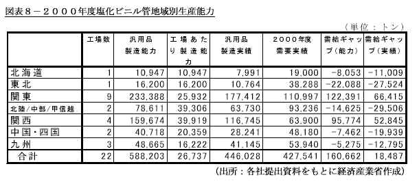 | 地域別に見ると、塩化ビニル管・継手協会会員会社11社の22工場は、全国に点在しているものの、関東及び関西の二極並びに九州・山口に生産力は集中しており、特に関東・関西地区については地域の需要を上回る供給能力がある。工場の生産能力を見ると、1工場あたりの年産平均約3万トンとなっているが、年間2万トン以下という比較的小規模な工場が8工場存在する。 |
