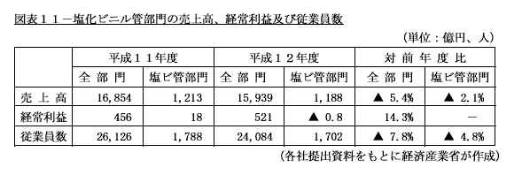 | 塩化ビニル管事業については、塩化ビニル製造業11社のうち8社は主力事業と位置づけているのに対して、3社は非主力事業であるが、販売流通面、雇用確保面から重要な事業と位置づけている。また主力事業としている8社のうち5社は不採算部門としている。 塩化ビニル管部門の売上高が全部門に占める割合は全社ベースの平均で7%、各社ベースでは数%から60%〜80%以上とばらつきが見られる。経常利益については、全部門ベースでは11社とも黒字であるものの、塩化ビニル管部門のみを見ると11社中5社が赤字となっている。従業員数についても塩化ビニル管部門の全部門に占める割合は7%、各社ベースでは数%から60%〜70%程度までばらつきが見られる。 塩化ビニル管製造11社の全部門及び塩化ビニル管部門に係る売上高、経常利益、従業員数について表にまとめると、下記のとおりである。 |