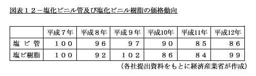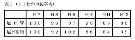 | 下記の表は各社の平成7年における塩ビ購入価格、平均的な塩ビ管の価格をそれぞれ100とし、当該年度の価格を指数化したものを単純平均したものであるが、塩ビ管価格は総じて漸減傾向にあるのに対し、塩ビ樹脂価格は上下はあるものの、必ずしも漸減傾向にあるとまでは言えない。 塩ビ管と塩ビ樹脂の価格変動差で見ると、企業によって変動にばらつきが見られるものの、平成8年、平成10年、平成11年においては8社乃至9社が塩ビ管の価格が塩ビ樹脂価格を上回っていたが、平成12年になり、全社とも塩ビ樹脂価格が上がったのに対して塩ビ管価格が据え置かれた形となっている。 |