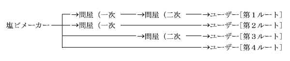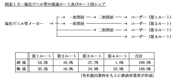 | 塩化ビニル管に係る流通は、概ね各社とも10社前後の一次問屋とその下に数百社の二次問屋をかかえるという構造となっている。末端の二次問屋に至っては1万近くあるともいわれ、また小規模事業者が多いことから脆弱な体質となっているが、その実態は十分には把握されていない。流通ルートも管工機材ルート、土木資材ルート、建設金物ルート等歴史的な経緯から各用途によって様々な流通ルートが存在しているが、一般的に塩化ビニル管のみを扱っている問屋はなく、塩化ビニル管の取扱のウェイトは販売金額ベースで3%〜10%程度となっている。一次問屋レベルでは、塩化ビニル管については1社のみの製品を扱う特約代理店に近いような問屋もあるが、二次問屋レベルでは一般的には多くのメーカーの製品を扱っている問屋が多い。 塩化ビニル管メーカーの流通ルート別の取扱量を示すと概要以下の通りとなっている。商流ベースでは、最終ユーザーに零細企業が比較的多いことからユーザー直送の第4ルートは少なくなっており、第1ルートのほか、第2、第3ルートが多く活用されている。他方、物流については、商流より簡略されたルートを取る傾向が高くなっており、流通からメーカーへ物流・在庫機能が一部転嫁され、メーカーの負担が増大していることの現れという見方もある。その原因は、問屋サイドだけの問題ではなく、過当競争によりメーカーが配送等の過剰サービスを行ってきたことにも起因するとの指摘がある。 |