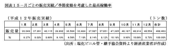 | 需要は平成12年度現在の46万トンが平成18年度には42万トン、平成23年度には39万トン程度まで減少すると見込まれており、同見通しによると平成12年度の製造能力67万トンと比較した平成12年度の供給余力21万トンは平成23年度には28万トンに拡大する。 季節変動を踏まえると、需要のピークに合わせ、一定程度の余剰設備を維持をする必要があるとの議論や金型交換などをなるべく行わずに効率的に生産をするためには余剰設備が必要になるとの生産現場サイドの考え方もある。 季節変動については、平成12年の月別販売実績(図表15)に基づいて、在庫ゼロを仮定して販売量が最大になる月に設備能力を合わせると、計算された年間稼働率は約82%になる。 |