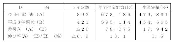 | 平成13年3月1日現在の塩ビ管の製造設備は392ライン、年間生産能力は673千トンであった。これは、前回調査(平成8年12月現在)の421ライン、595千トンと比べライン数は29ライン、6.9%減少したが、年間生産能力では逆に78千トン、13.1%の増加となっている。これは、設備更新時に高性能設備が導入されたためと考えられる。 一方、生産実績は、平成12年は480千トンと前回調査の455千トンと比べて5.6%の伸びに留まっているため、生産能力と生産量の差は拡大しており、全社の平均稼働率は71%(平成8年76%)となっている。主要企業へのヒアリングの結果でも設備の過剰感があると答えた企業が多かった。 |