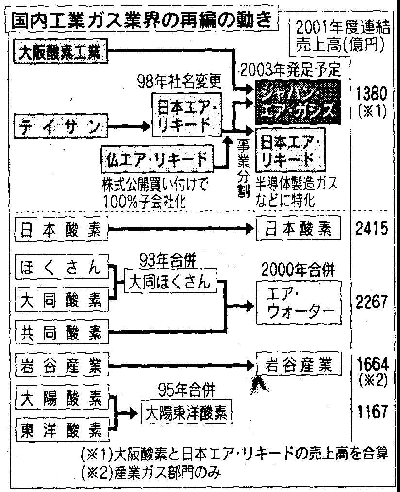 2004/1 新日鉄化学の工業ガス事業の販売部門を事実上、買収