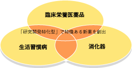 味の素(株)の医薬品事業の重点分野として、「臨床栄養医薬品」「消化器」「生活習慣病」の3分野に注力しています。国内の臨床栄養医薬品分野については、味の素ファルマ(株)の設立により、販売を含めフルファンクションにて展開しています。また、消化器、生活習慣病の分野では、研究開発に特化し、特徴あるグローバル新薬の創出に向けて、重点的な資源投入を図っていきます。