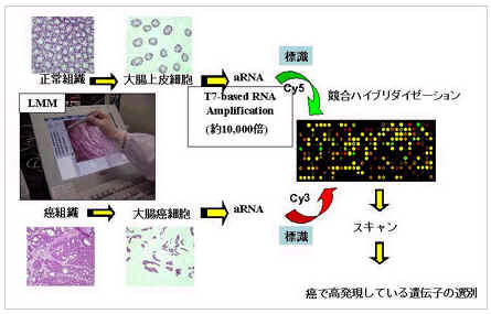 弊社では、癌関連遺伝子の体系的発現情報解析のため、約30,000種類の遺伝子が網羅的に解析できるcDNAマイクロアレイのシステムを構築しており、ヒトの全遺伝子の80%前後を一度に調べることが可能です。また、今までは、癌組織から直接RNAを回収していたので、癌細胞に加え正常細胞の混入も多く、結果として癌細胞における遺伝子発現変化が反映できないことが多くありました。そこで我々は、レーザーマイクロビームマイクロダイセクション(LMM)という技術を用い、人の癌組織から癌細胞のみを取り出し、癌細胞だけでの遺伝子発現変化をほぼ100%見いだすことに成功しました。