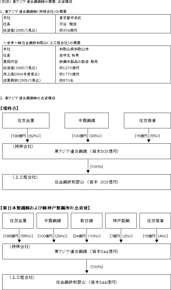 (但し株式会社住友金属直江津及び株式会社住友金属小倉の事業は含まず)4.事業規模 :売上高1,500億円/年程度、生産規模100万トン/年程度(実績ベース) 5.統合期日 :平成15年10月1日 6.事業統合の方法 :共同新設分割 7.株式割当比率 :新日鐵80:住金20